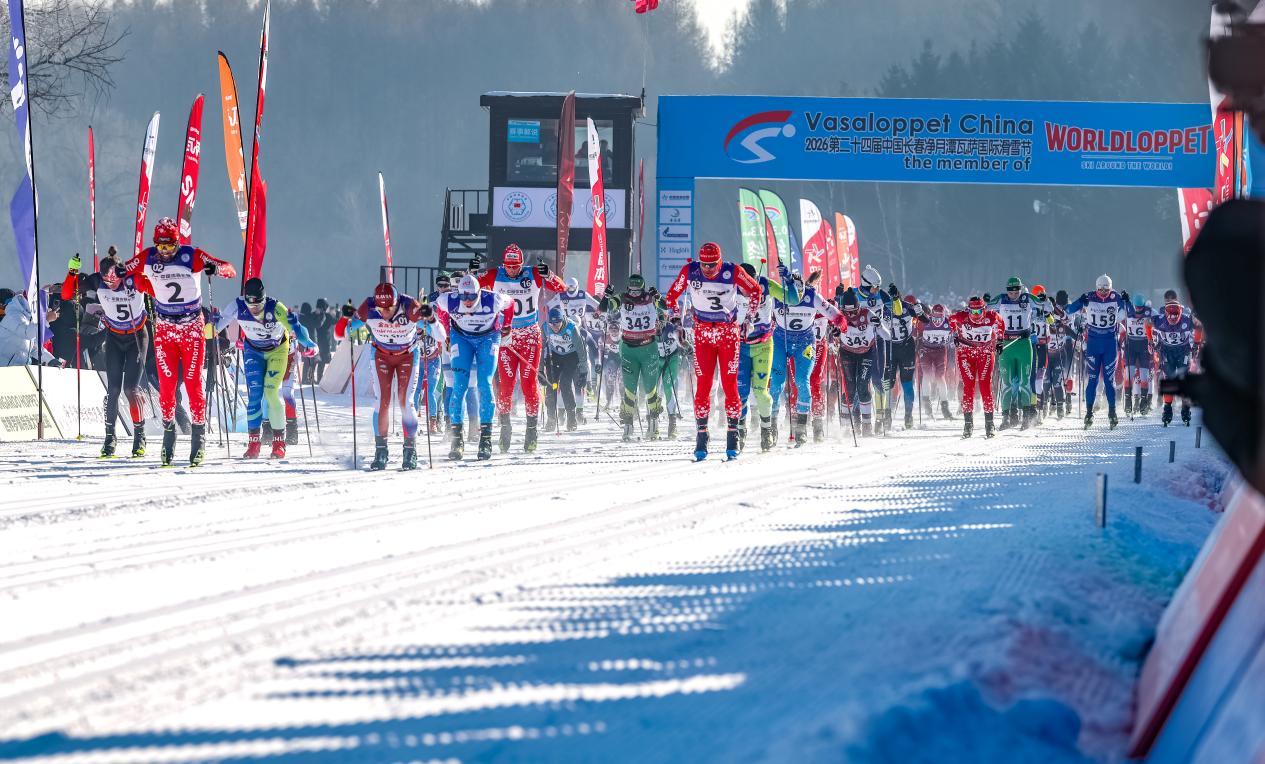 (第24届中国长春净月潭瓦萨国际滑雪节现场,鸣枪后选手共同出发)
